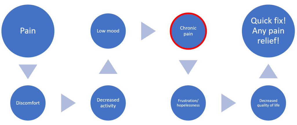 Chronic pain can benefit from medications for temporary pain relief, but without working on contributing factors to the pain itself, symptoms inevitably return. Over time, one may lose sight of what is contributing to their pain experience. That’s when seeking more drugs seems to be the only logical solution. This tunnel vision cascades into larger issues in the long run.