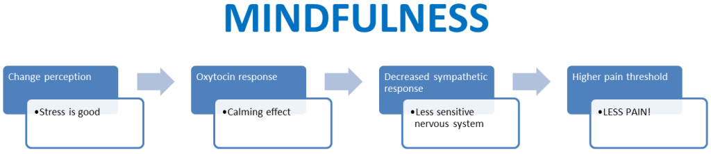 Learning about strategies to manage stress is essential to managing chronic pain. If we perceive our stress response as helpful instead of harmful, it would decrease our sympathetic nervous system response, and result in higher pain thresholds. In fact, it has been shown that people who manage stress more healthily have a lower risk of dying, when compared to those who do not manage it well. This is independent of level of stress experienced, meaning that someone who experiences high levels of stress but manage it well have a lower risk of dying than someone who experiences little stress but does not manage it well.