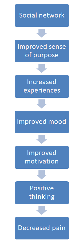 With our social network, we are more likely to have new experiences, learn and grow, stay motivated to reach goals, and have more joy and laughter in life, all of which will enhance our positive emotions, and influence our thoughts in a positive way. Positive thinking and positive affect help to manage pain.